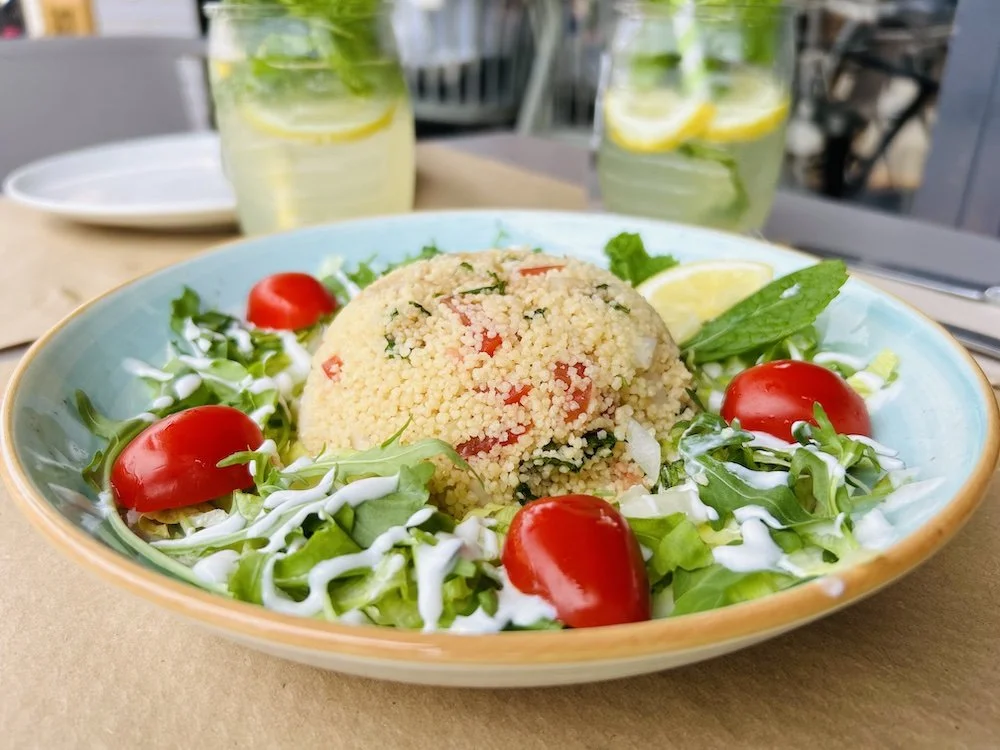 Empezamos pidiendo una ensalada Tabulé (cuscús con salsa de yogur) y para picar un Falafel con mayonesa de sésamo (riquísimo). No podíamos dejar de probar un Kebab, el de “toda la vida” según su carta, y elegimos el de pollo, con mix de ensalada y salsa de yogur (excelente). Para los argentinos y uruguayos que extrañan su comida, deberán pedir el “Criollo”, que lleva pan caliente, carne a la brasa, provolone, pimiento asado y chimichurri (exquisito).